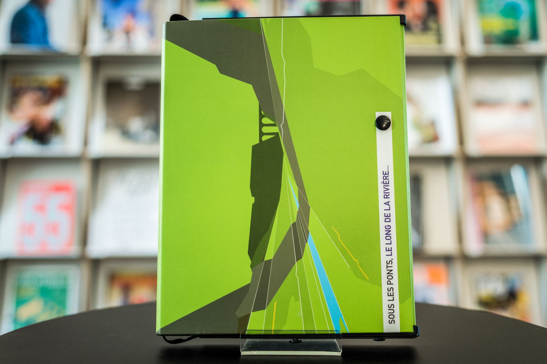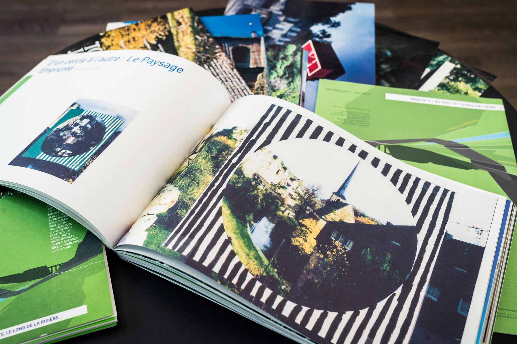 Catalogue présenté ensemble avec un mini-guide trilingue (français, anglais, allemand), un dépliant, des cartes postales couleur DIN-A4 illustrant les projets in situ, et un journal/affiche bilingue (français, anglais) de l’artiste Ivana Keser dans une boîte 22 × 30,5 cm avec bouton pression et sangle.
